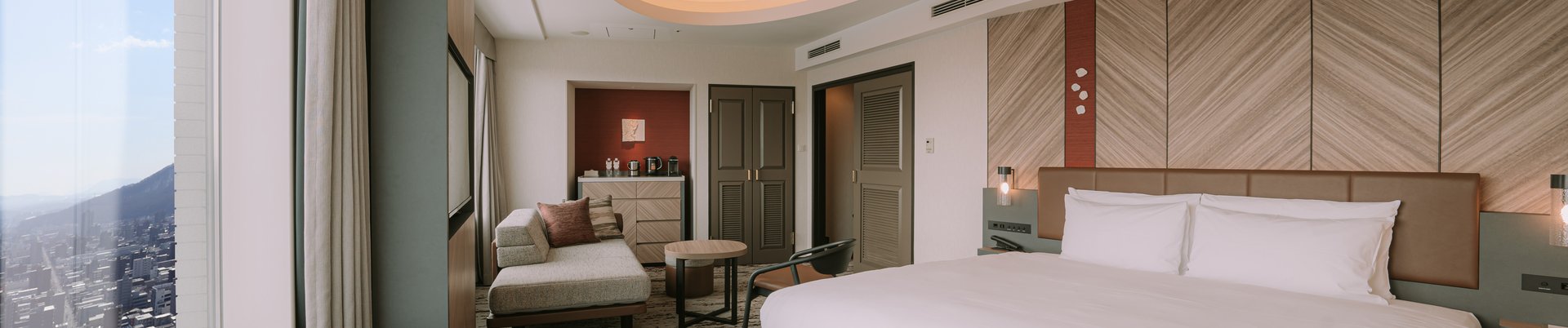 ベッドを窓に向けて配置し、窓際にラウンジコーナーを設けるなど、煌めく夜景を存分に堪能できる空間づくりに配慮。