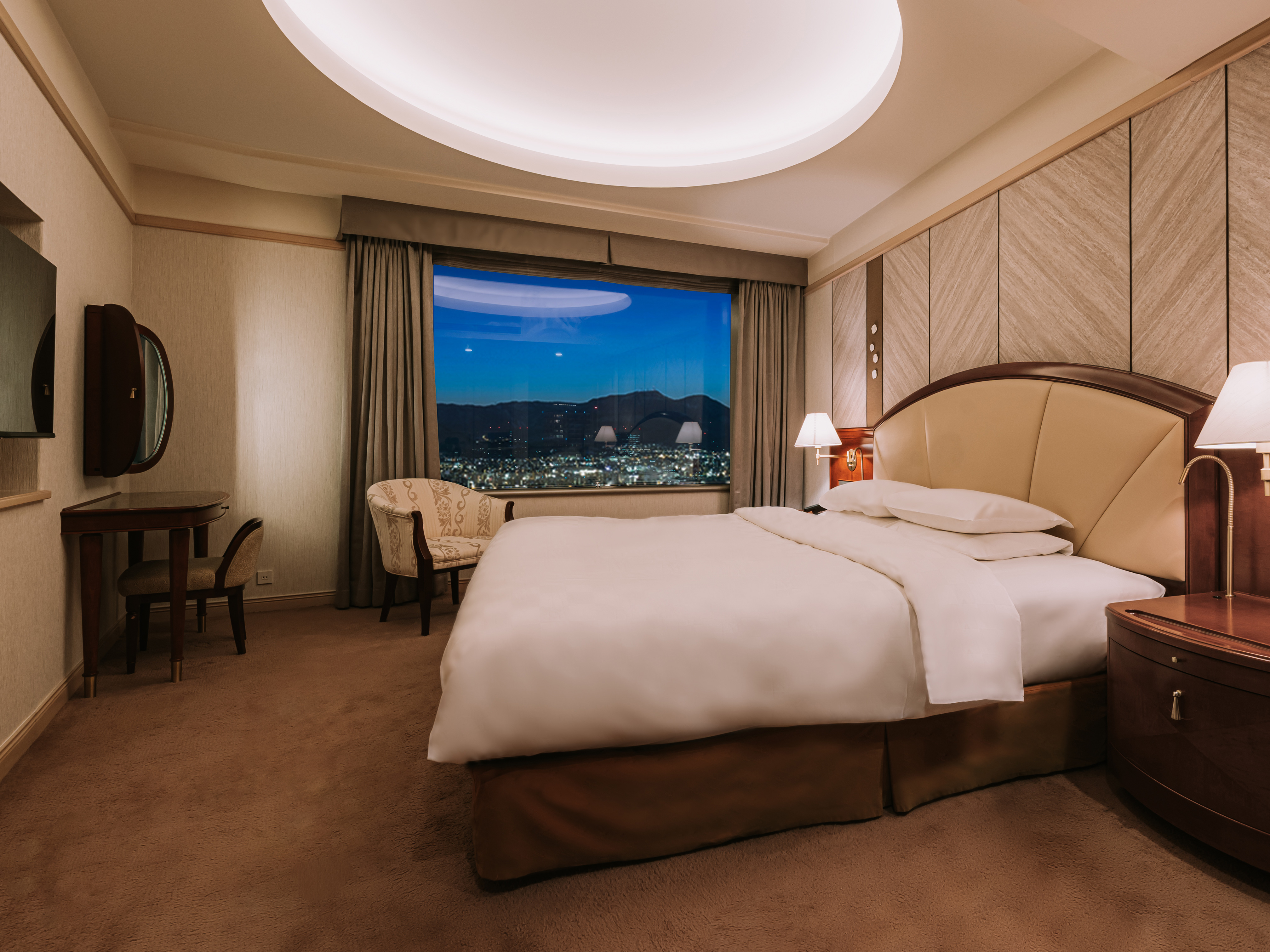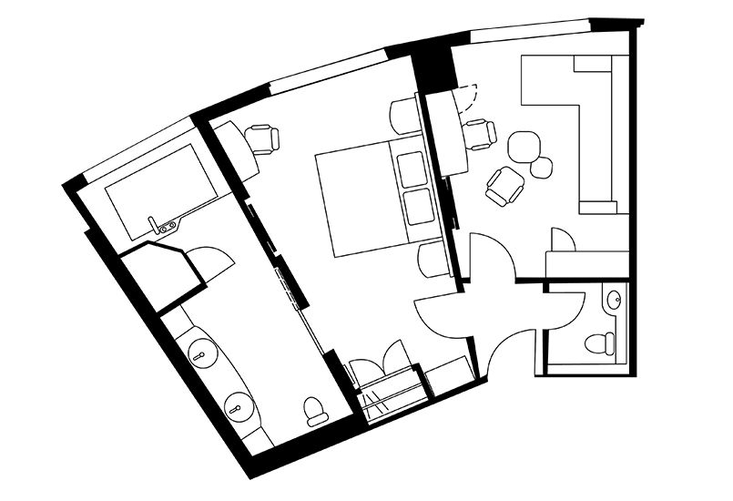 リビングルームと、キングサイズのダブルベッドを備えるベッドルームの2部屋からなり、ゆとりあるつくりの客室。