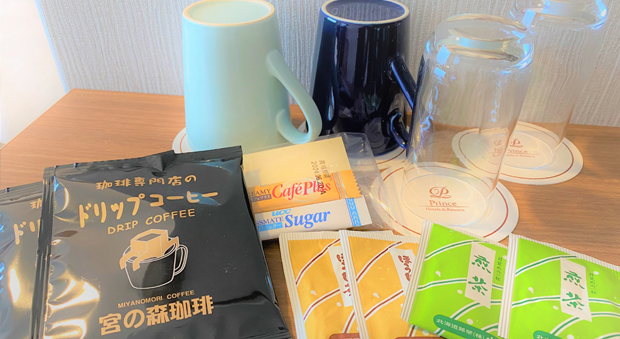 「宮の森珈琲(1F)」のドリップコーヒーや、北海道銘茶「土倉」のティーバッグをご用意しております。※写真は2名さま用。