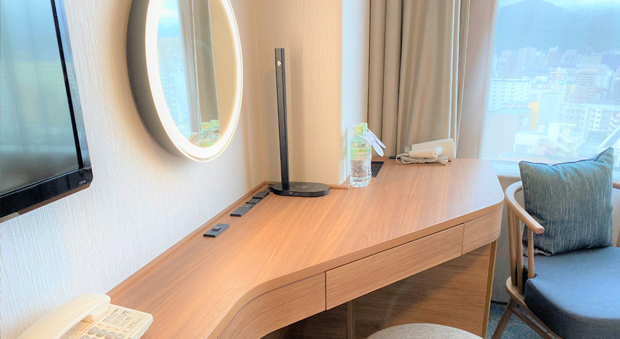 シモンズ社製ベッド/加湿空気清浄機/テレビ/電話機/冷蔵庫/マイナスイオンドライヤー/電気ケトル/温水洗浄便座/ワイヤレス充電対応デスクライト/マルチ携帯充電器/セーフティーボックス/モーニングコールは8カ国語に対応(日本語、英語、韓国語、中国語、フランス語、ドイツ語、ロシア語、スペイン語)
