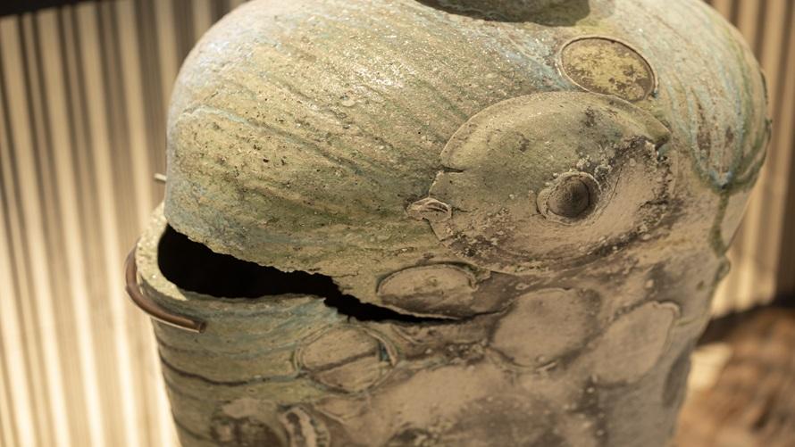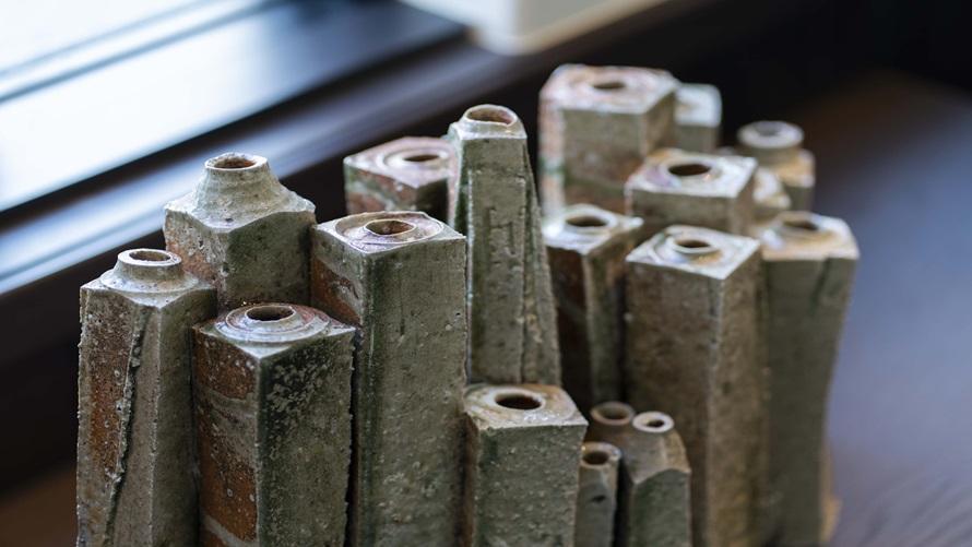 塊(かい)という名のごとく、穴窯で焼かれたこの大胆な作品は、様々な自分への当たり前であった豊かな環境を打ち砕くかのように時に鋭利である。