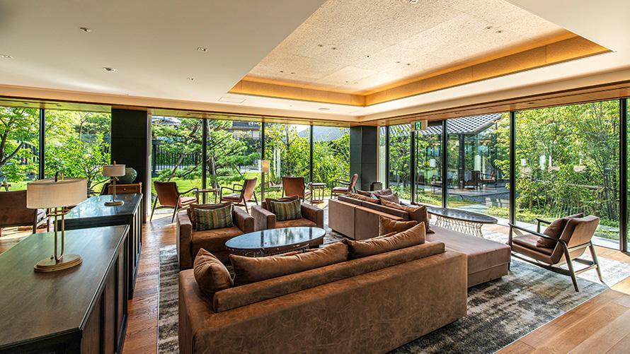 陽光をたっぷりと取り込む、全面ガラス張りのホテルゲスト専用ラウンジ。