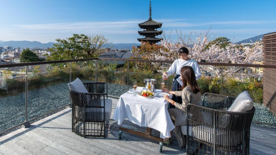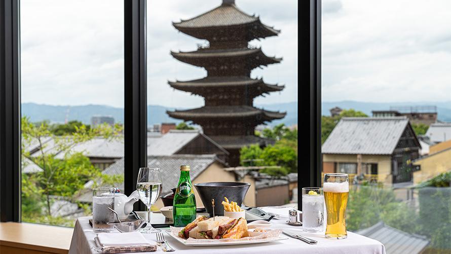 レストラン併設のテラス席からは京都の西山を臨みながら朝食をお楽しみいただけます。オープンエアーな空間で絶景を見ながらの朝食は絶品です。