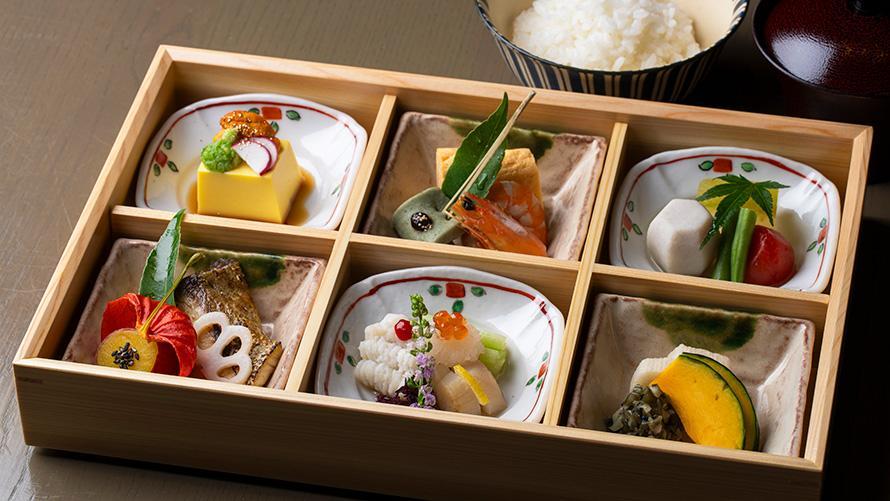 京都の食材を使った京料理の和膳。6種類の器に季節のお料理が盛り込まれ、彩り鮮やかな1品です。