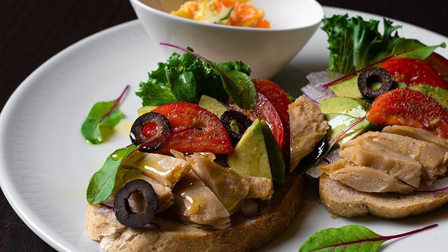 彩り野菜でボリュームも有り、美味しく体に優しいオープンサンドです。