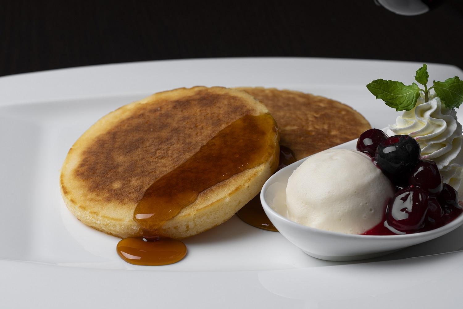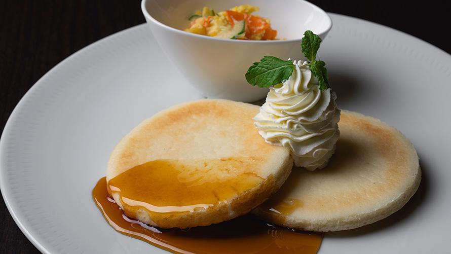 小麦の代わりにモチモチの米粉を使用。コクと深みのある甘さのアカべシロップを使っており、ヘルシーなパンケーキです。