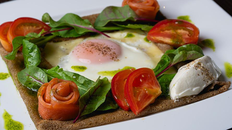 そば粉のガレットを濃厚卵とチーズ、スモークサーモンと共に。トマト、ルッコラ、サワークリームで味の変化をお楽しみください。