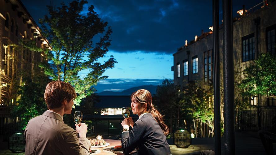 レストラン・ライブラリーに併設されたオープンテラスでも、ライトアップされたホテルの煌めくコートヤードを見ながら食事をお楽しみいただけます。
