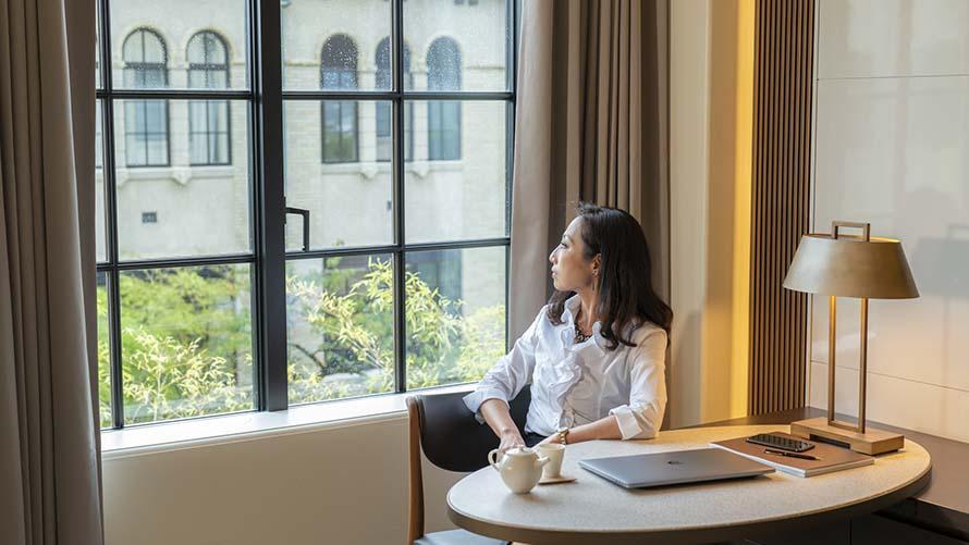 当時の窓枠を活かしたクラシカルな窓や梁を残した内装は優雅で上質な京のご滞在を演出いたします。