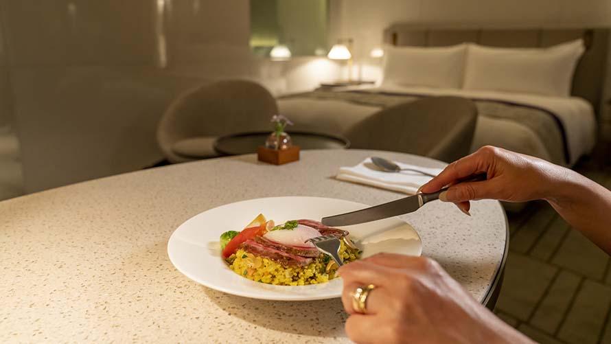 ご朝食とラウンジに加え、お部屋で召し上がれる軽食を1日1食お楽しみいただけます。