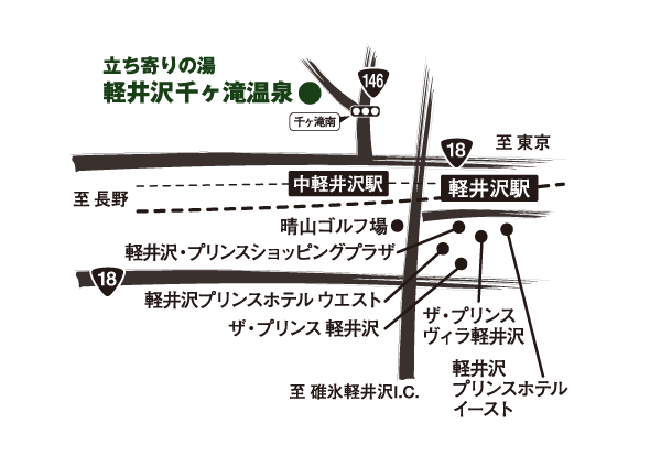 ■電車 北陸新幹線(長野経由)「軽井沢駅」からタクシーで約15分。 または、しなの鉄道「中軽井沢駅」からタクシーで約5分。 万座温泉行きまたは、草津温泉行きバスで約7分、千ヶ滝温泉下車。
