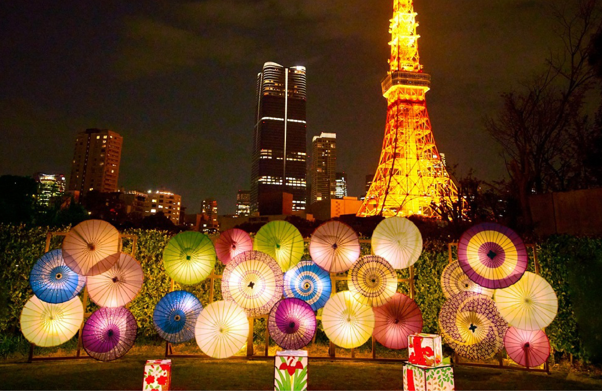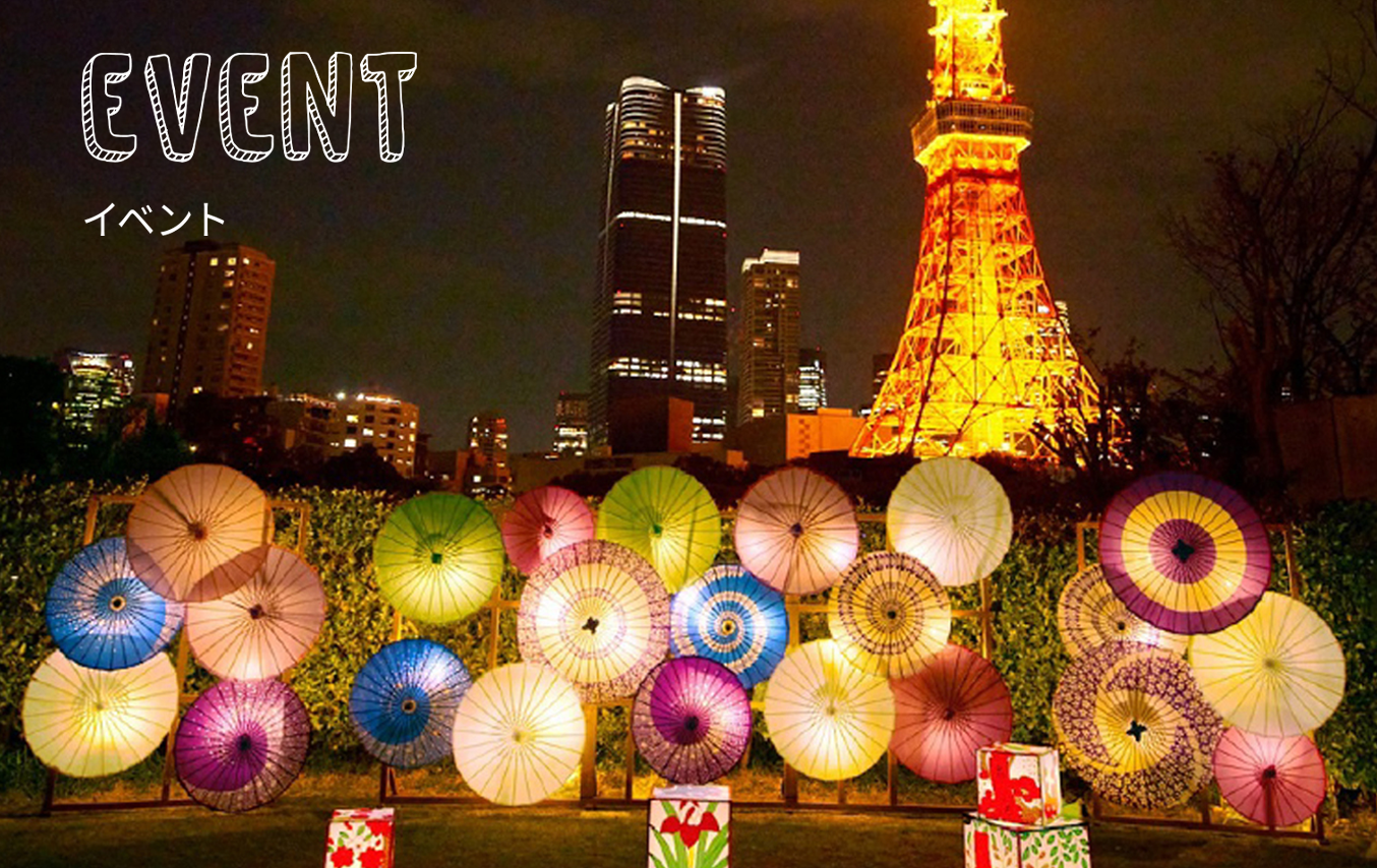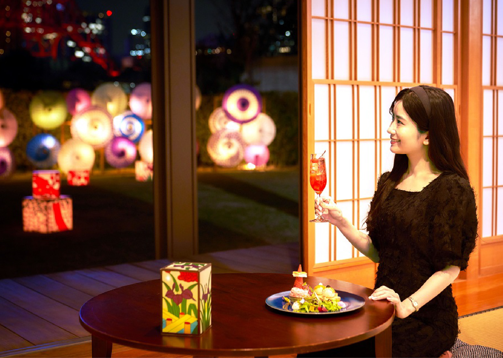 東京タワーが目の前にそびえる会場が期間限定バーに。提灯に彩られた空間でスペシャルプレートとドリンクを堪能したら、プライベート庭園で東京タワーと和傘のフォトジェニックな景色を楽しんで。