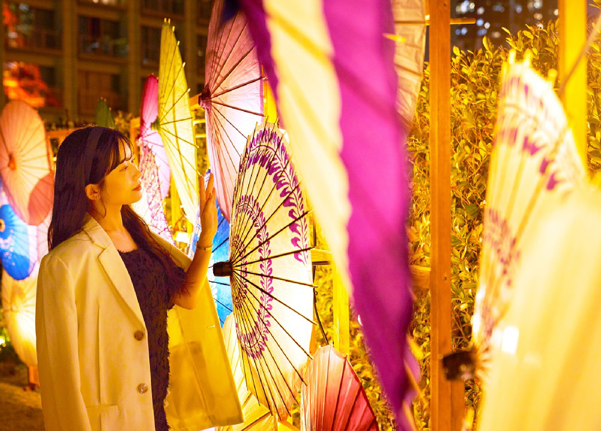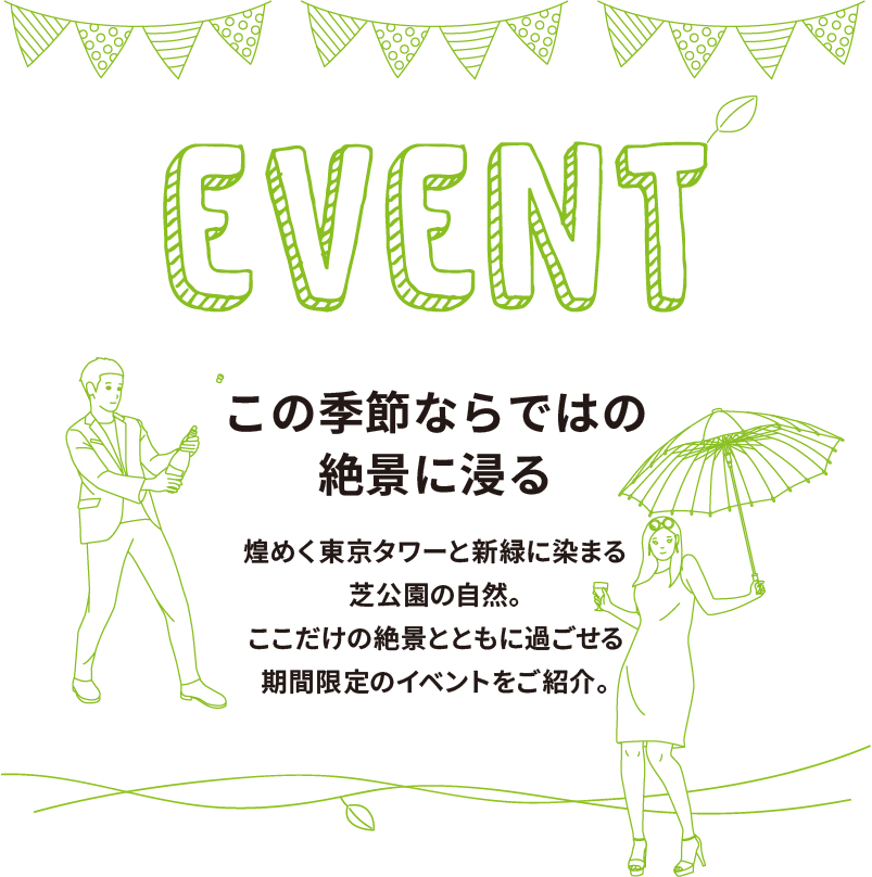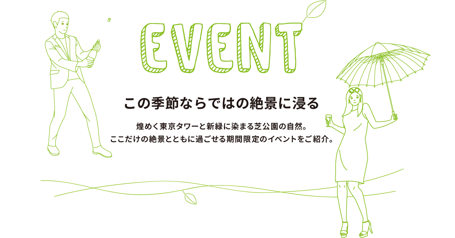 東京タワーが目の前にそびえる会場が期間限定バーに。提灯に彩られた空間でスペシャルプレートとドリンクを堪能したら、プライベート庭園で東京タワーと和傘のフォトジェニックな景色を楽しんで。
