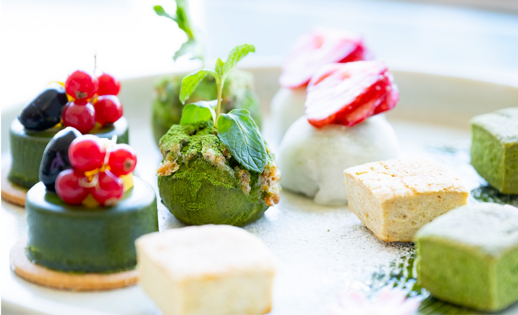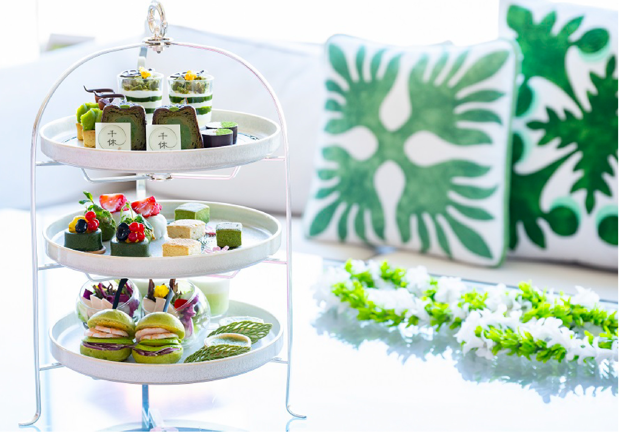 スイーツには濃い緑色で抹茶の奥深い味わいが特徴の“おくみどり”と、ホテルオリジナルブレンドの抹茶を2種使用。さらにセイボリーも初夏らしいグリーンを基調としたラインナップで味や見た目で初夏を感じられるアフタヌーンティーです。
