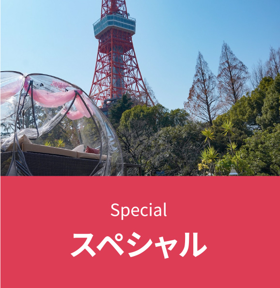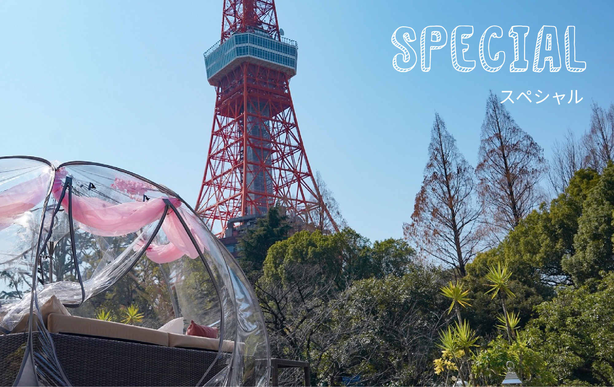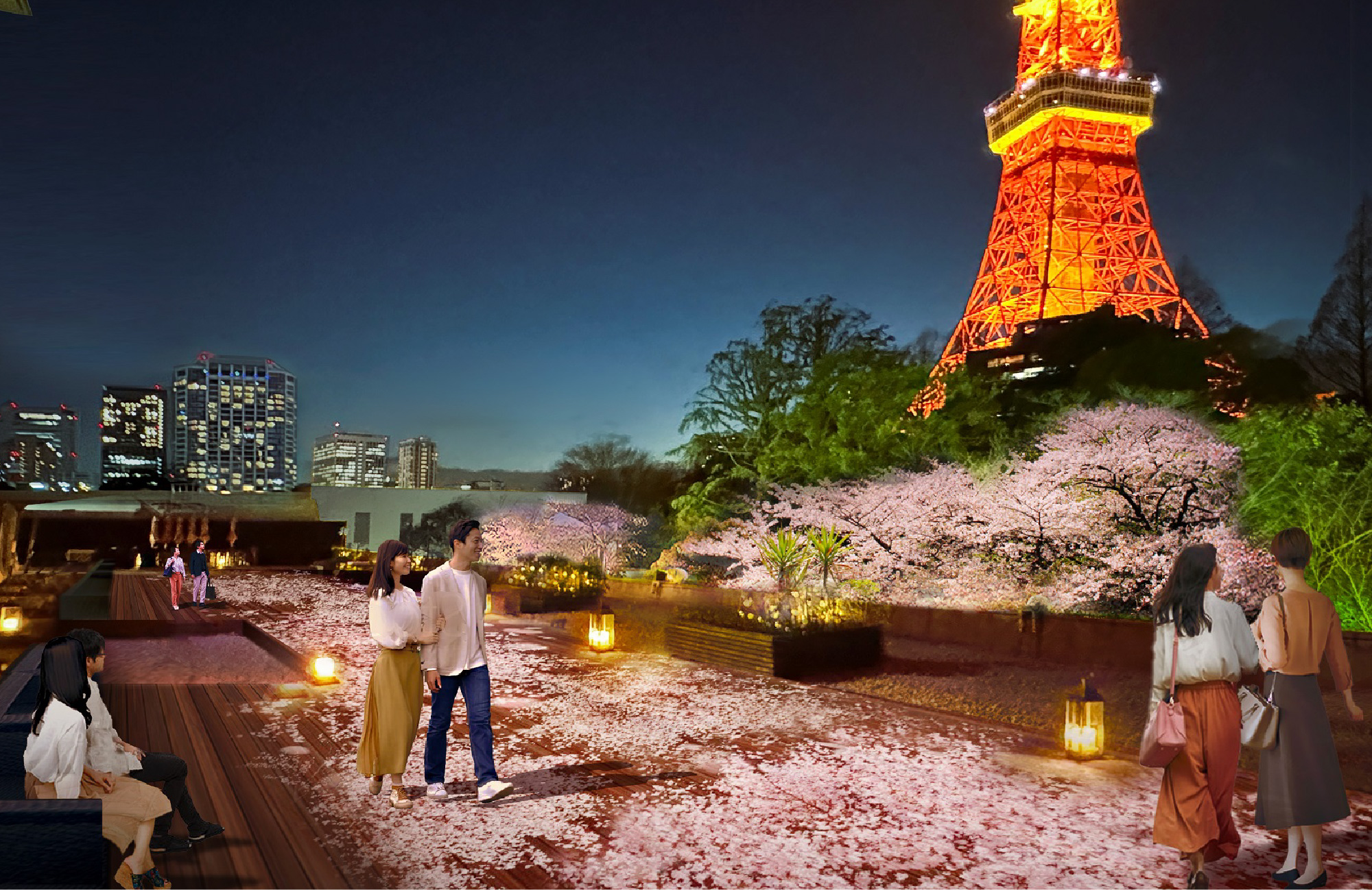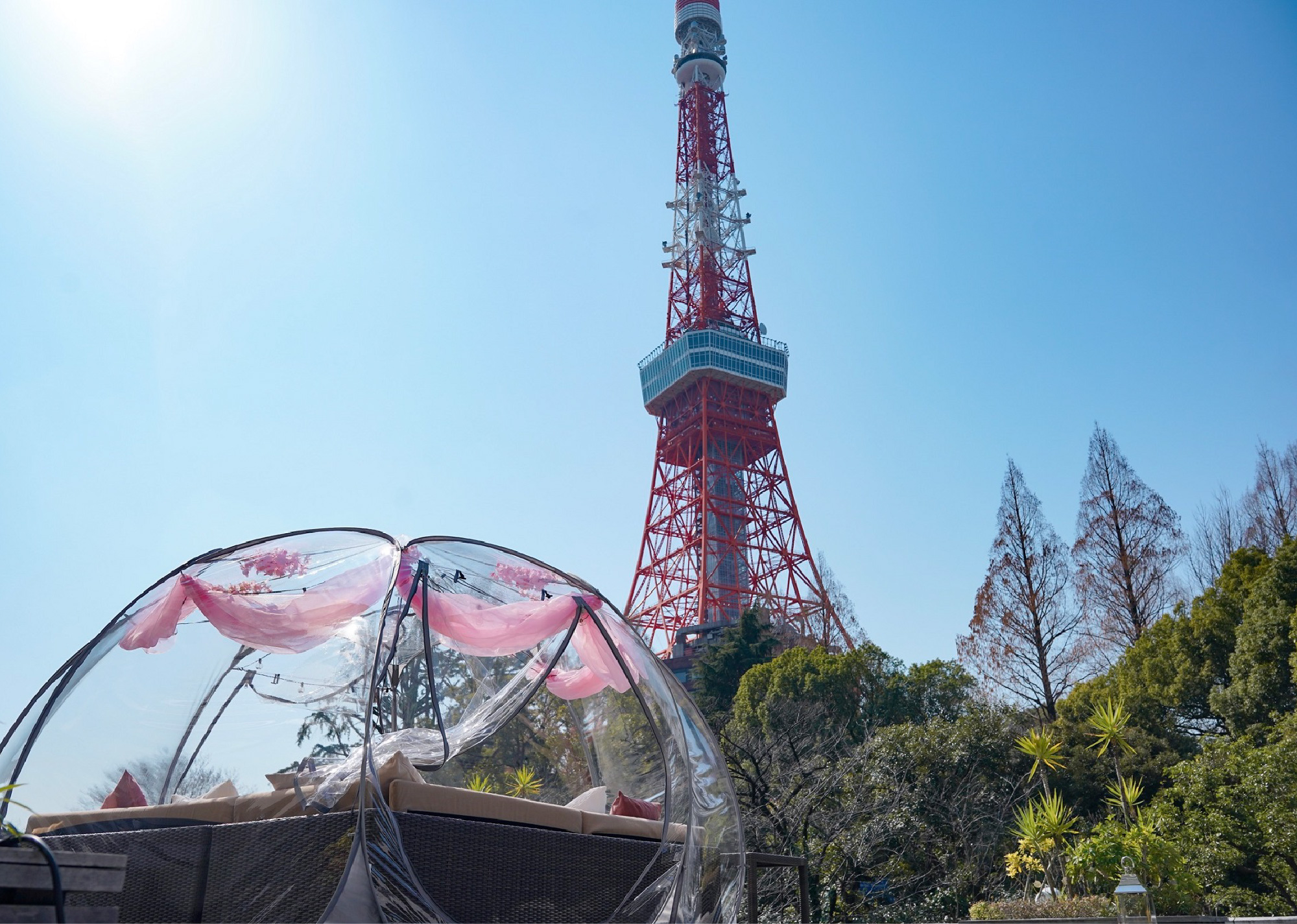 プロジェクションマッピング カフェ&バー タワービューテラス(3F) 2024.5.31(Fri.)まで 春だけの特別な絶景体験。 東京タワーを間近に臨む「カフェ&バータワービューテラス」。春シーズン限定でテラス一面にさくらや春の花々が舞い散る「花あかり」の世界。デジタルとリアルが融合した、ここでしか叶わない絶景が広がります。たっぷり堪能したい方は1日3組限定の、さくらのデコレーションに包まれたドームテント「SAKURA BUBBLE」もおすすめです。