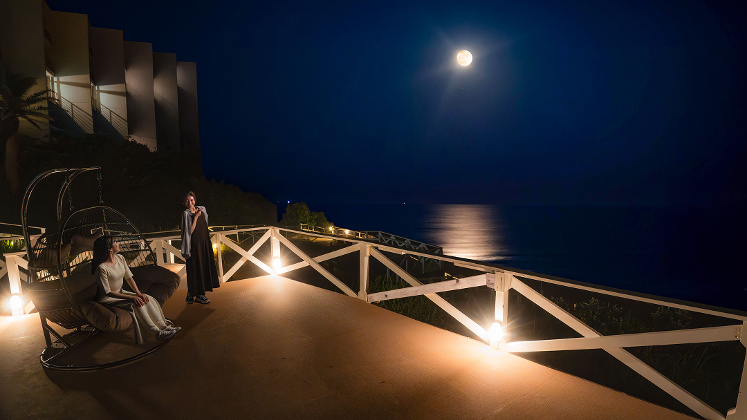 静寂の夜空にぽっかりと浮かぶ満月、洋上に映し出される月明りに道が幻想的な雰囲気を演出します。翌朝には朝陽と波音で目覚め1日が始まります。隣接する「白濱神社」で参拝することで月、太陽、神社のパワーをチャージするスピリチュアル体験を。