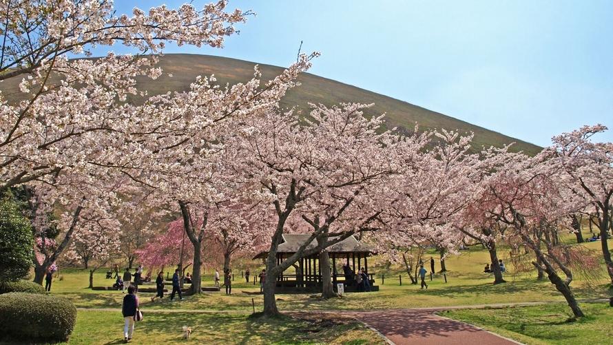 伊東市の大室山のふもとに広がるさくらの里。1,000本の桜が植えられ、4月上旬には淡いピンク色の花びらに覆われたソメイヨシノが40,000平方メートルの敷地を埋め尽くします。さくら名所100選のお花見スポットです。9月~5月までさまざまな品種の桜がそれぞれ開花します。