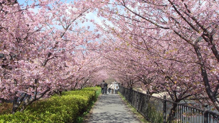 濃いピンク色に染まる川沿いを散策し、ひと足早い春の訪れを感じてみませんか?