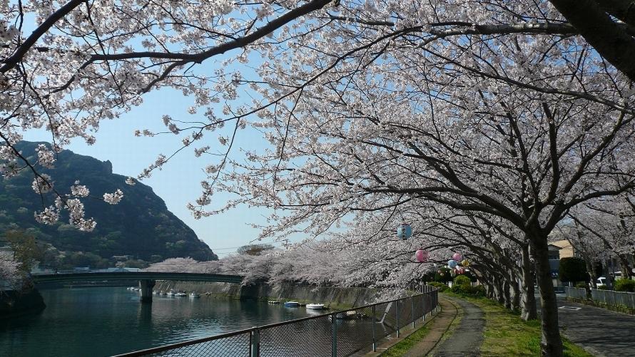 下田駅のほど近く、本郷公園周辺の稲生沢川沿いに約730mにわたる桜並木があります。約270本ほどのソメイヨシノに沿って遊歩道があり、頭上をトンネルのようにしなった枝は川の上までせり出しています。
