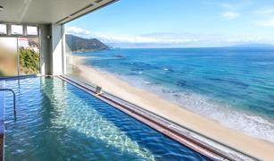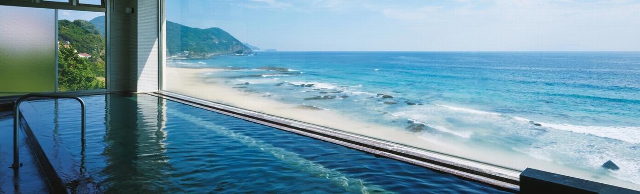 太平洋に面した横10mの一枚ガラス越しに、伊豆七島の島々や洋上から昇る朝日を見ることができます。