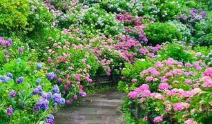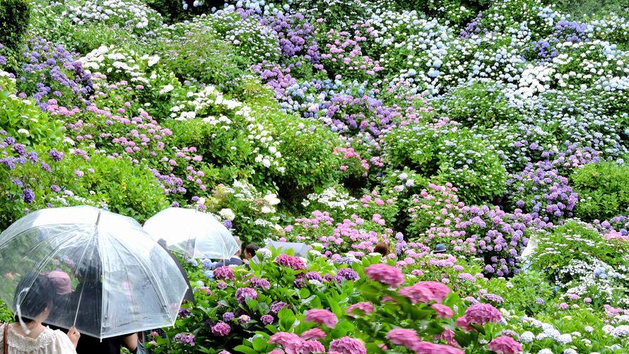 下田公園は下田市街と下田港を一望できる絶景スポット。そんな広大な敷地を約300万輪ものあじさいが彩り、青や紫、ピンクなど多彩なグラデーションが訪れる人々を魅了します。
