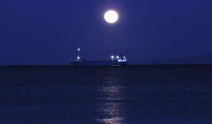 静寂の闇夜にぽっかりと浮かぶ月。柔らかな光の揺らぎが海面に伸びる幻想的な光景です。