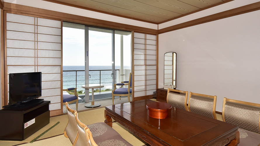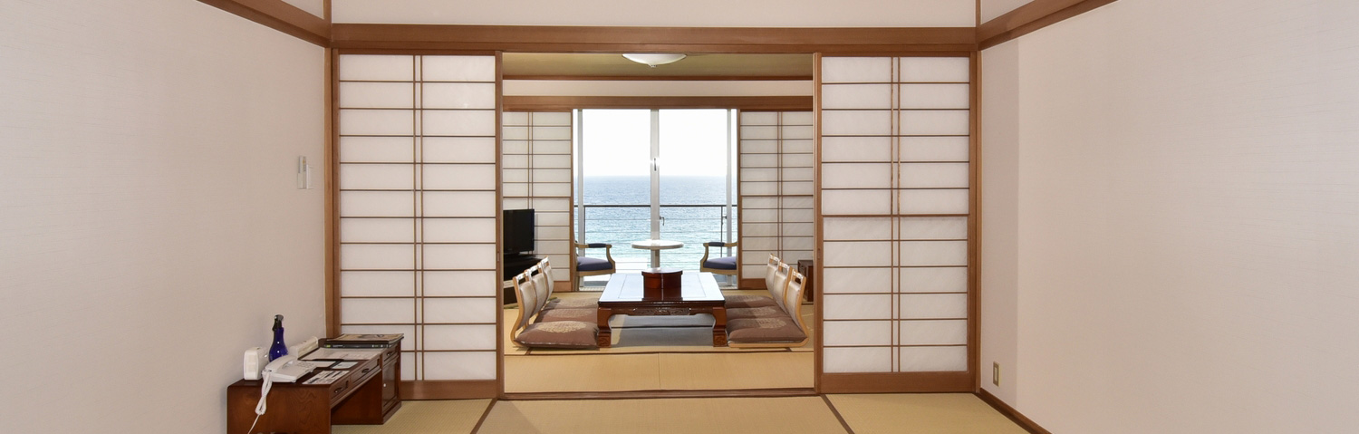 広さ48.8平米の大きめの和室です。10畳と8畳のゆったりとした二間続きの客室に最大7名さままでご利用できます。※お布団を利用の際は、ご自身で敷いていただきます。