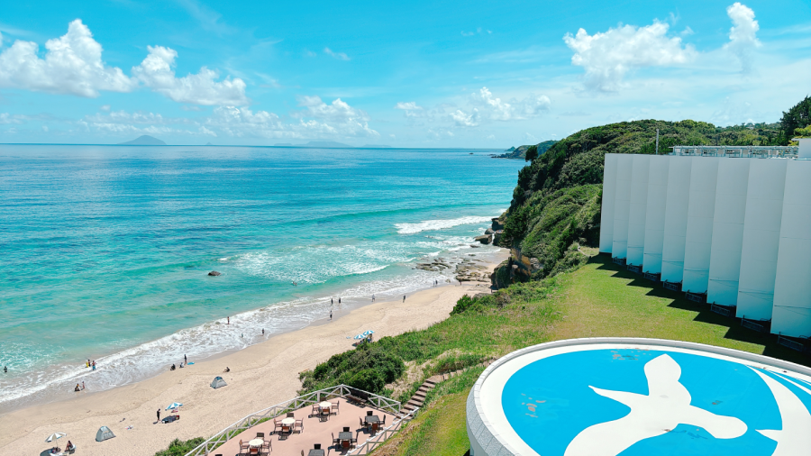 エメラルドグリーンに輝く雄大な海を目の前にしたロケーションは南国情緒あふれ開放感いっぱいです。期間:2025年7月19日 (土) ~ 2025年8月31日 (日)