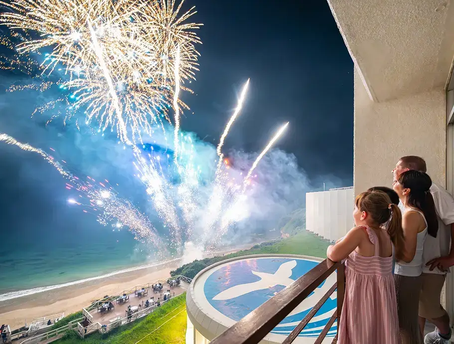 下⽥の夏の夜を彩る花⽕をオーシャンフロントテラスから観賞。ホテル⽬の前の海岸から打ち上がる迫⼒の輝きと轟きを、遮るもののない特等席でゆったりと満喫。