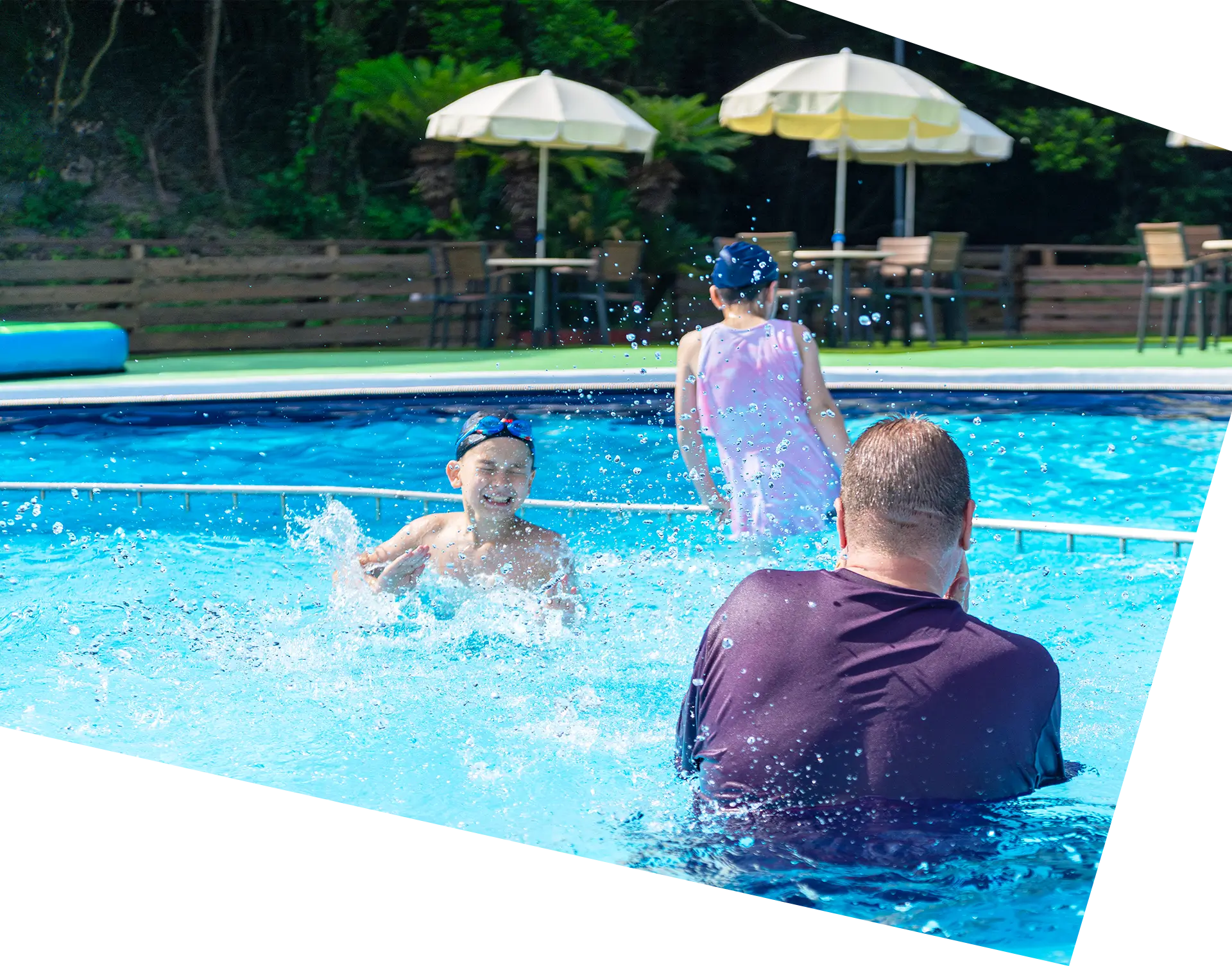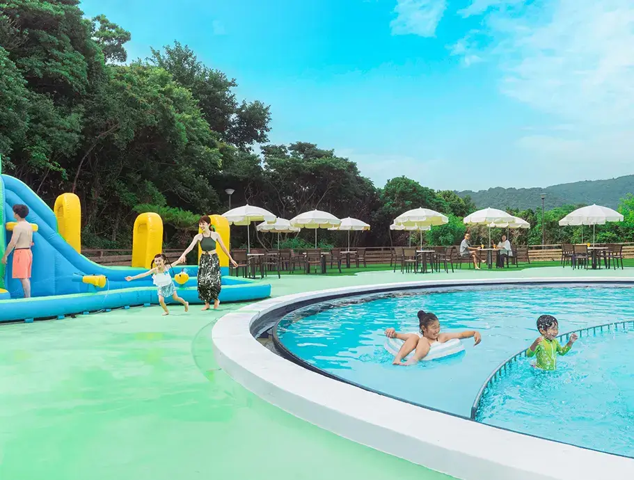 今夏もプールサイドに「エアスライダー」が登場!水深も区分されており、お子さまも思いきり遊べます。プールサイドには、パラソルやテーブル&チェアが配置され、ご家族で思い思いの時間を過ごせます。