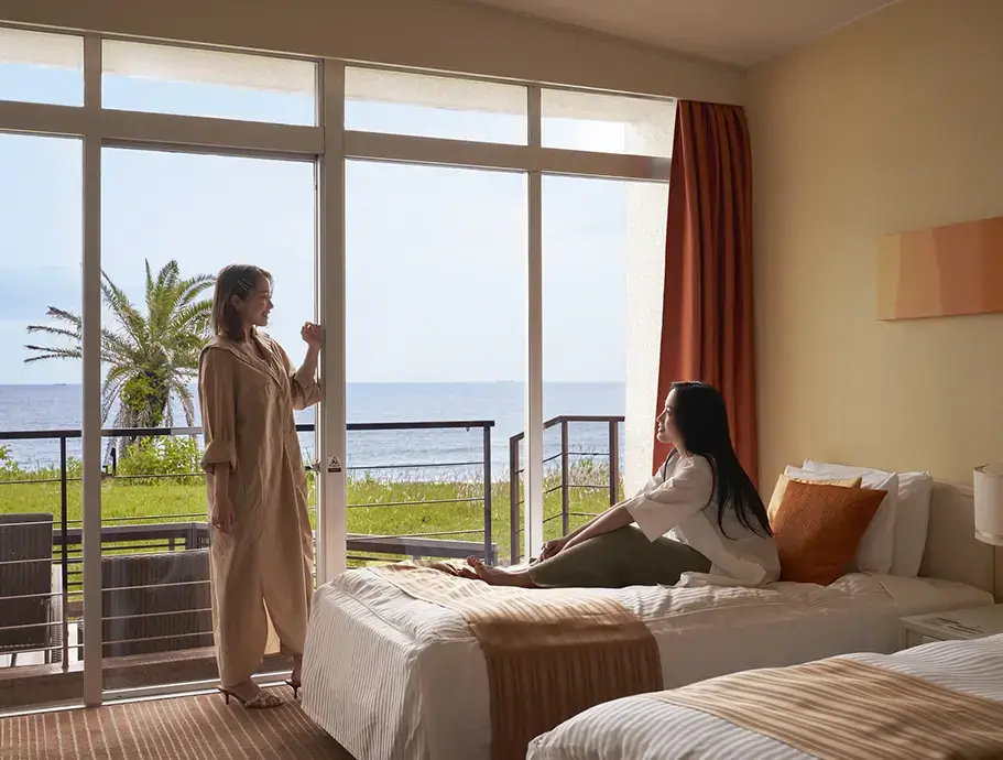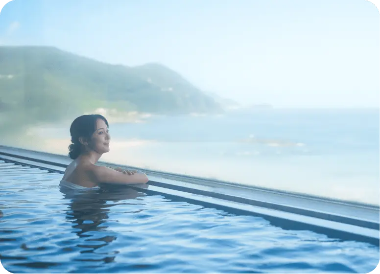 水平線から昇る太陽の日の光を浴びて目覚める清々しい朝。テラスに出れば、目の前には潮騒が聞こえる静かな朝のビーチが広がります。日の出とともにOPENするオーシャンビューの絶景温泉は、朝活にもおすすめです。