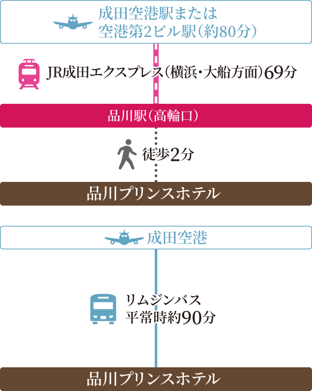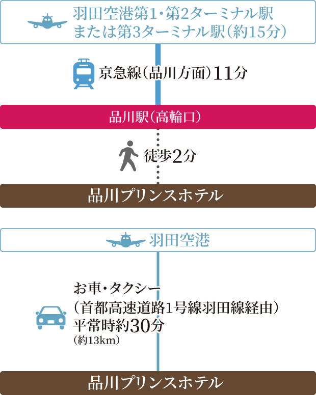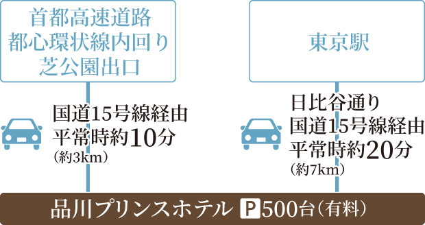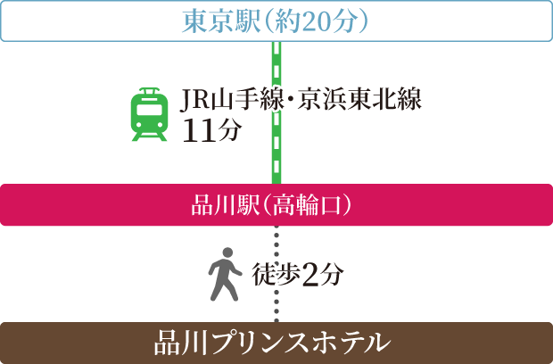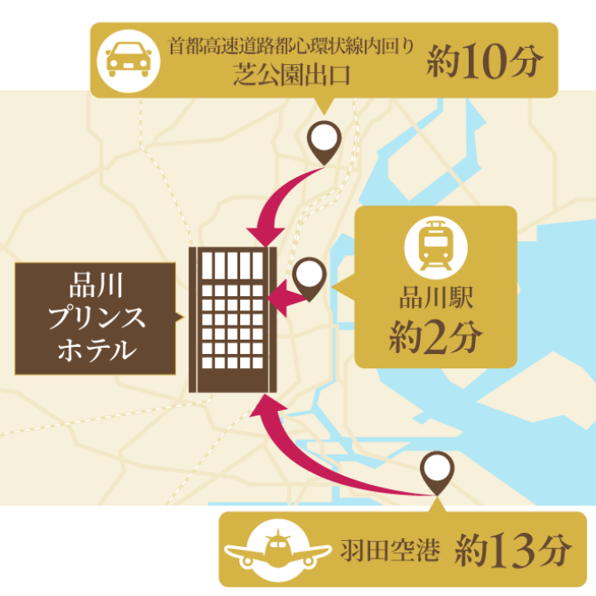 品川プリンスホテルは、品川駅から徒歩約2分とアクセスが大変便利です。駐車場には限りがございますので、電車・バスをご利用ください。