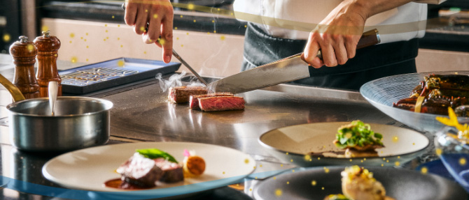 ライブキッチンでのパフォーマンス、音と光、映像による演出とお料理が楽しめる新感覚のエンターテイメントブッフェレストランです。
