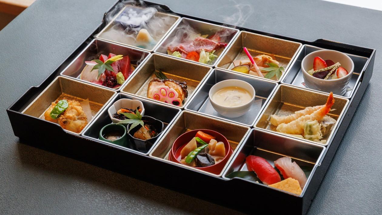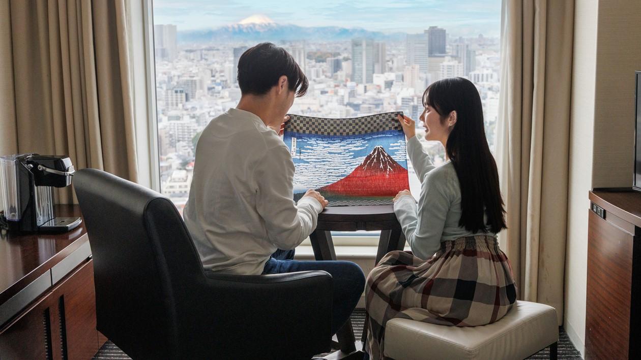 夕朝食付きプランでは、季節の恵みを丁寧に仕立てた「富士山御膳」をゆったりと。ご宿泊者さま全員にお持ち帰りいただく葛飾北斎『富嶽三十六景』の風呂敷も旅の彩りに。また、富士山が望めない日も、ささやかなプレゼントで思い出をそっと添えます。
