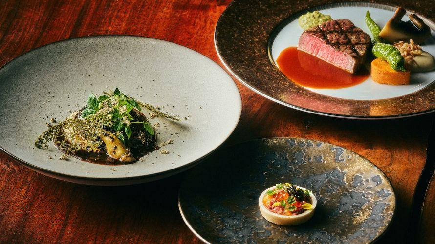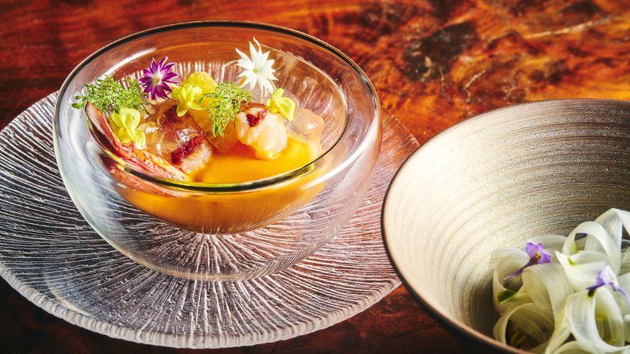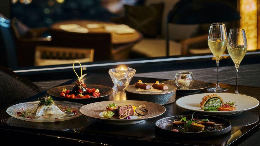 ショーキッチンを配したスタイリッシュな空間のフュ―ジョンダイニングで、夜景を望みながら音楽とともに五感で楽しむ贅沢コース。
