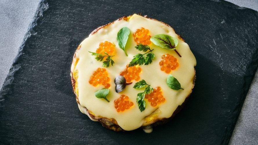 ◆兵庫県明石の明石焼きよりインスピレーションを受け、スペイン風オムレツトルティーヤと明石焼きの融合させた一皿です。