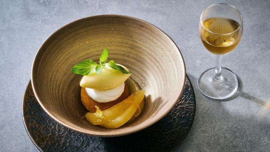 紀州南高梅を純米原酒で仕込んだ賀茂泉の梅酒をふんだんに使用したサヴァラン。柑橘がほのかに香る梅酒シロップを染みこませたブリオッシュに、お好みでさらに梅酒をかけてお召しあがりください。