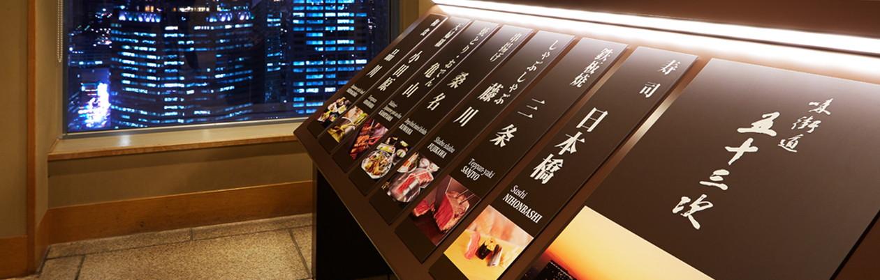 和食・寿司・天婦羅・しゃぶしゃぶ・鉄板焼き・串揚げ・焼き鳥など7つの和食処と9つの個室がございます。