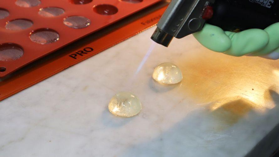 接着点をバーナーで炙り粘着性を持たせて、バランスを調整しながらエアダスターで風を入れ固定させます。