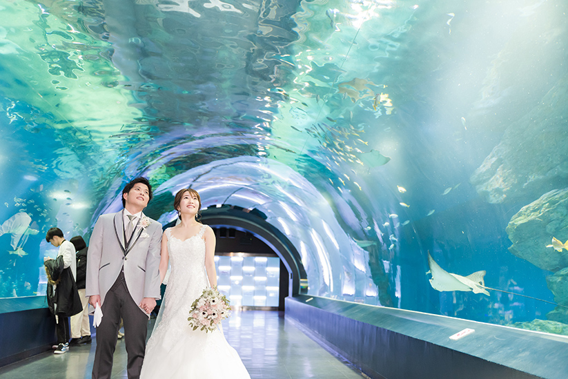 水族館での前撮り撮影は、ほかでは撮れない幻想的で神秘的なシーンを創りあげます。