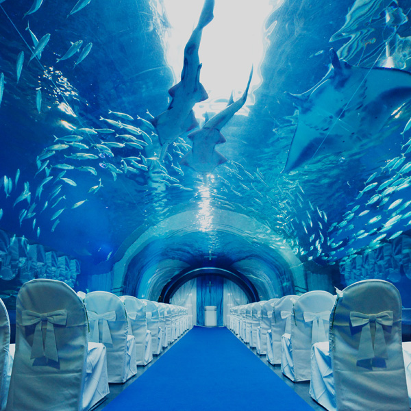 水族館を貸し切り、海中トンネルに椅子を並べてバージンロードに。見上げれば水面にはキラキラと差し込む光、バージンロードにはゆらめく波の模様が。