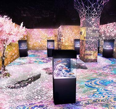 イマーシブエリア「パターンズ」では、22台のプロジェクターを使用し壁には日本画のような美しいタッチでさまざまな“桜”が描かれ、そこに風情を感じる「霞」がかかります。