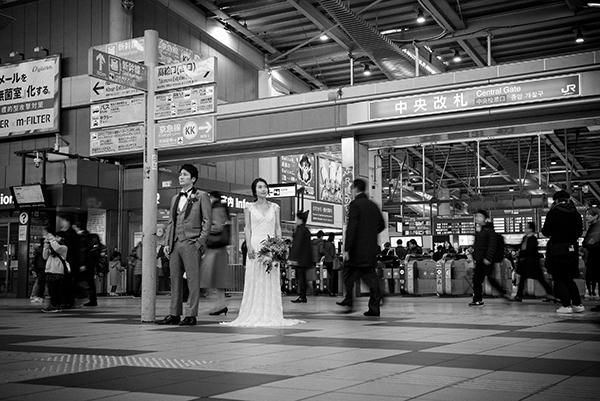 毎日、多くの人が行き交う品川駅での撮影は、日常に溶け込むおふたりらしい写真から