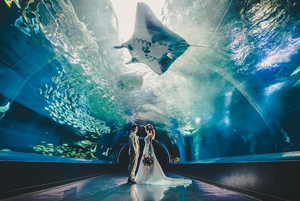 魚たちが優雅に泳ぎ、光が差し込むと水面がキラキラと輝く、水族館での撮影は幻想的で神秘的なシーンを創り上げます。