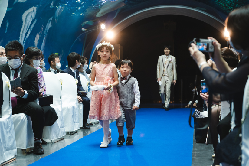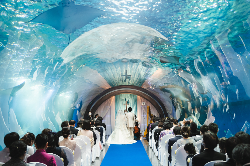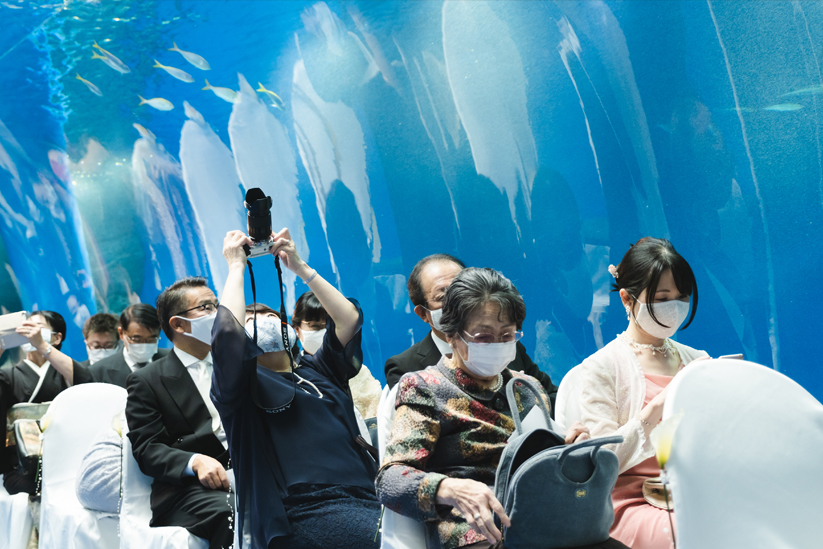 爽やかな陽光が差し込み、これから始まる結婚式を祝福するかのようにきらきらと輝くトンネルとその中を優雅に泳ぐ魚たち。ゲストの皆さまは見上げるように写真を撮っていらっしゃいました。