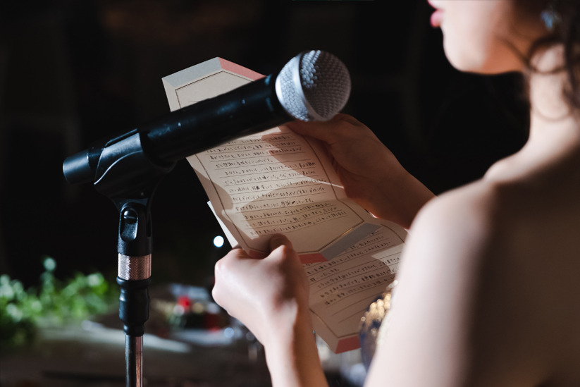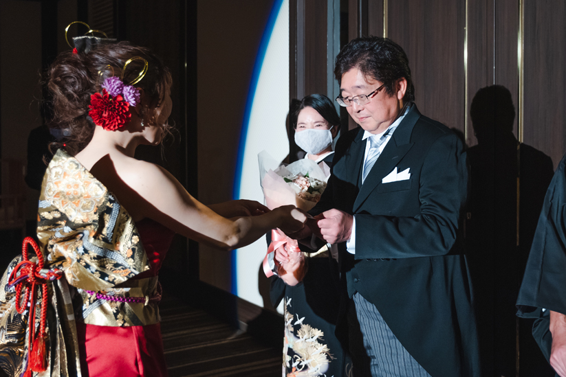 ご披露宴のお開きの前には、ご新婦さまから親御さまへ感謝の気持ちを伝えるお手紙の朗読とおふたりからの花束の贈呈が行われ、会場は一層温かな雰囲気となりました。