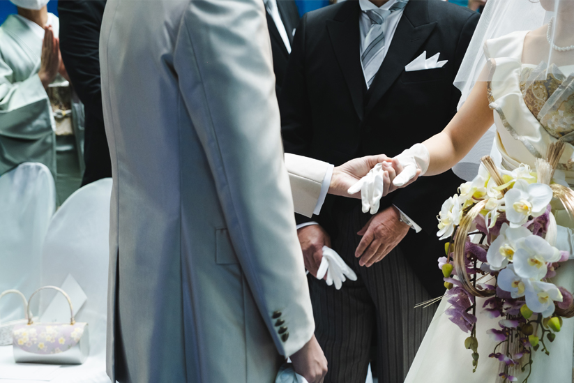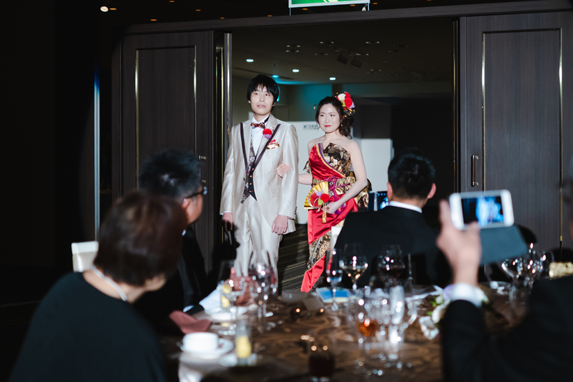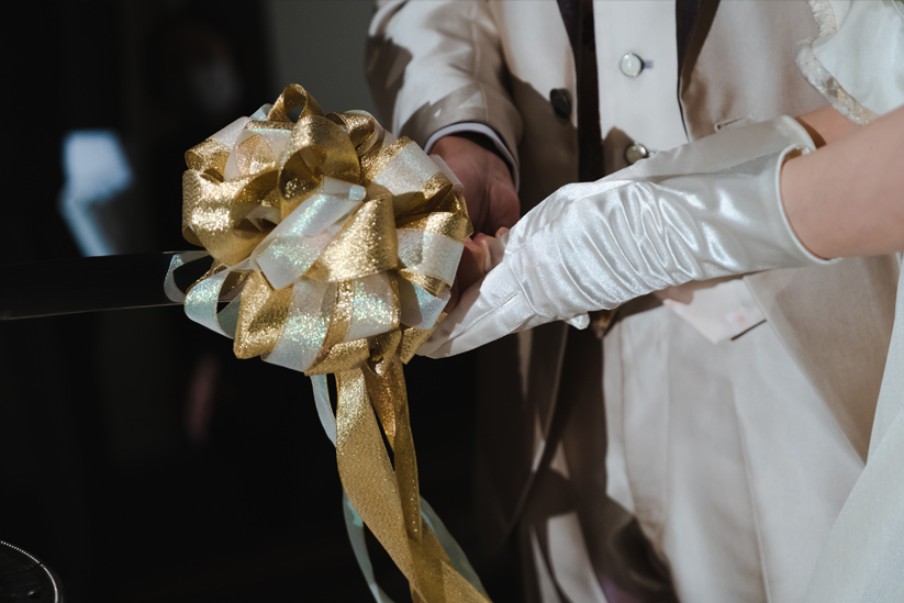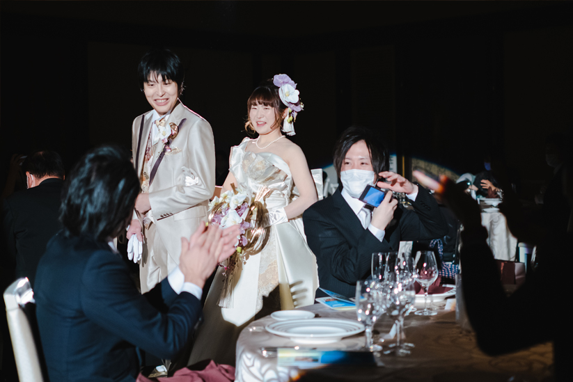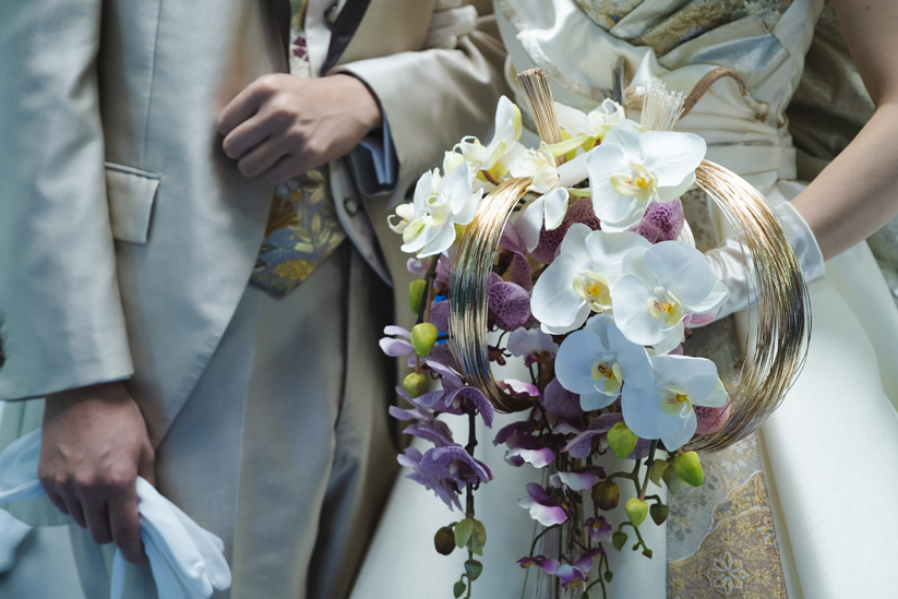 ご実家が寺院のご新郎さま。おふたりのお衣裳には和のテイストが盛り込まれていました。