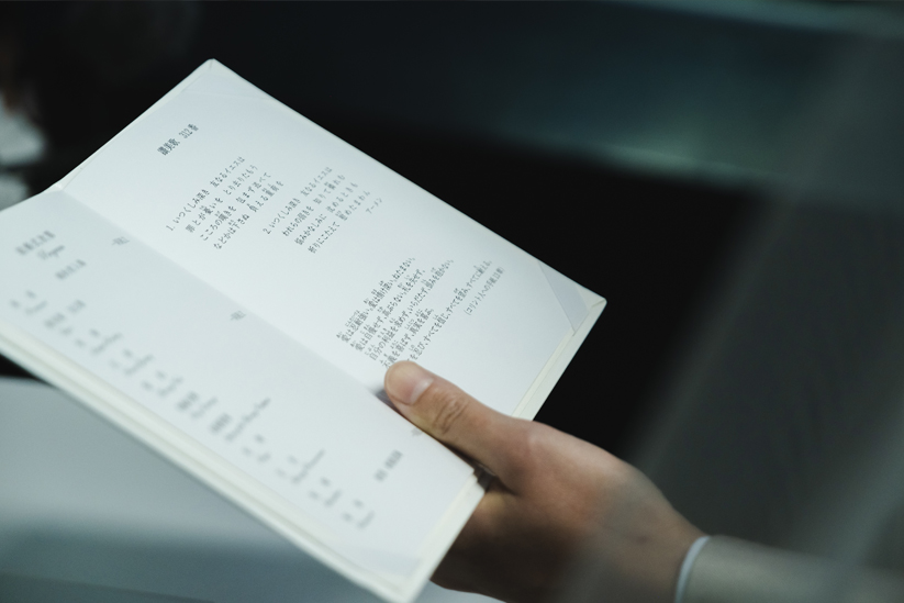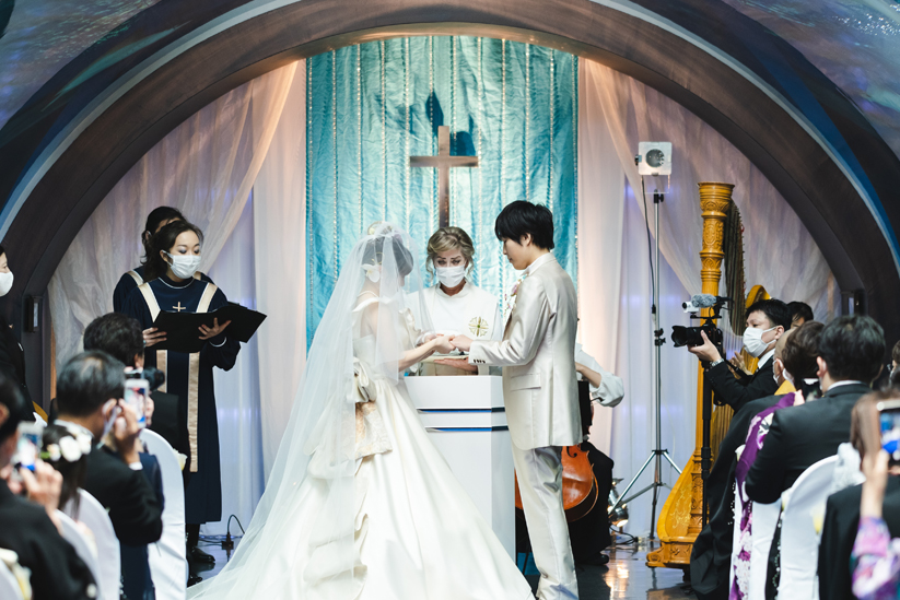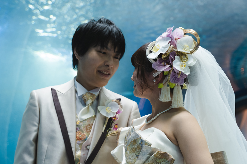 和のテイストをアクセントにしたドレスとタキシードに身を包んだおふたり。集まったゲストの方々と水族館の魚たちに見守られ、女性牧師の司式のもと誓いのセレモニーを行いました。
