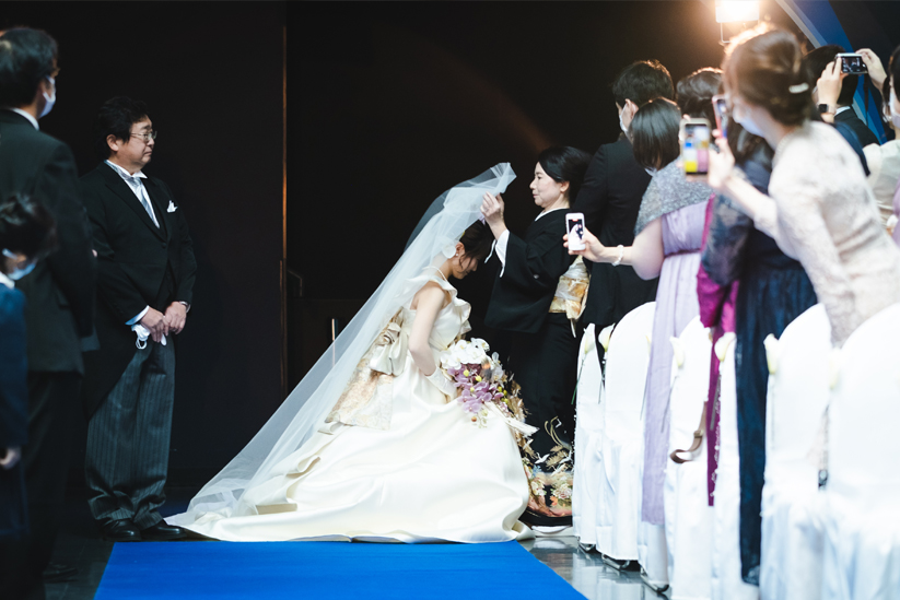 お父さまに手を取られたご新婦さまが登場すると、ひときわ大きな拍手が。