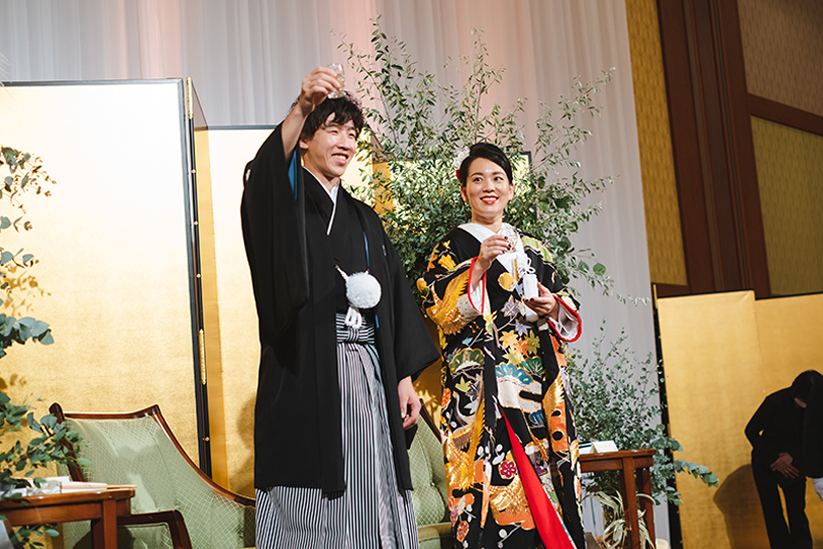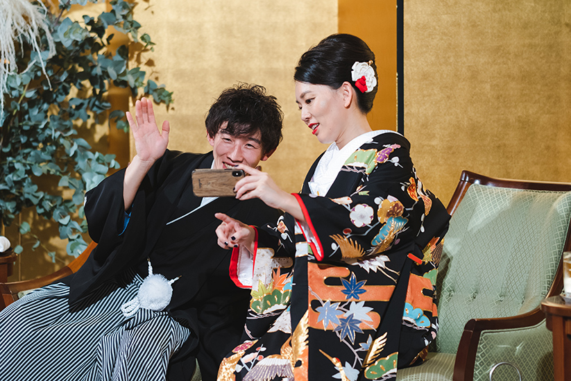 神聖な結婚式をとの思いから外部の神社にて親族のみの挙式を行ったおふたり。